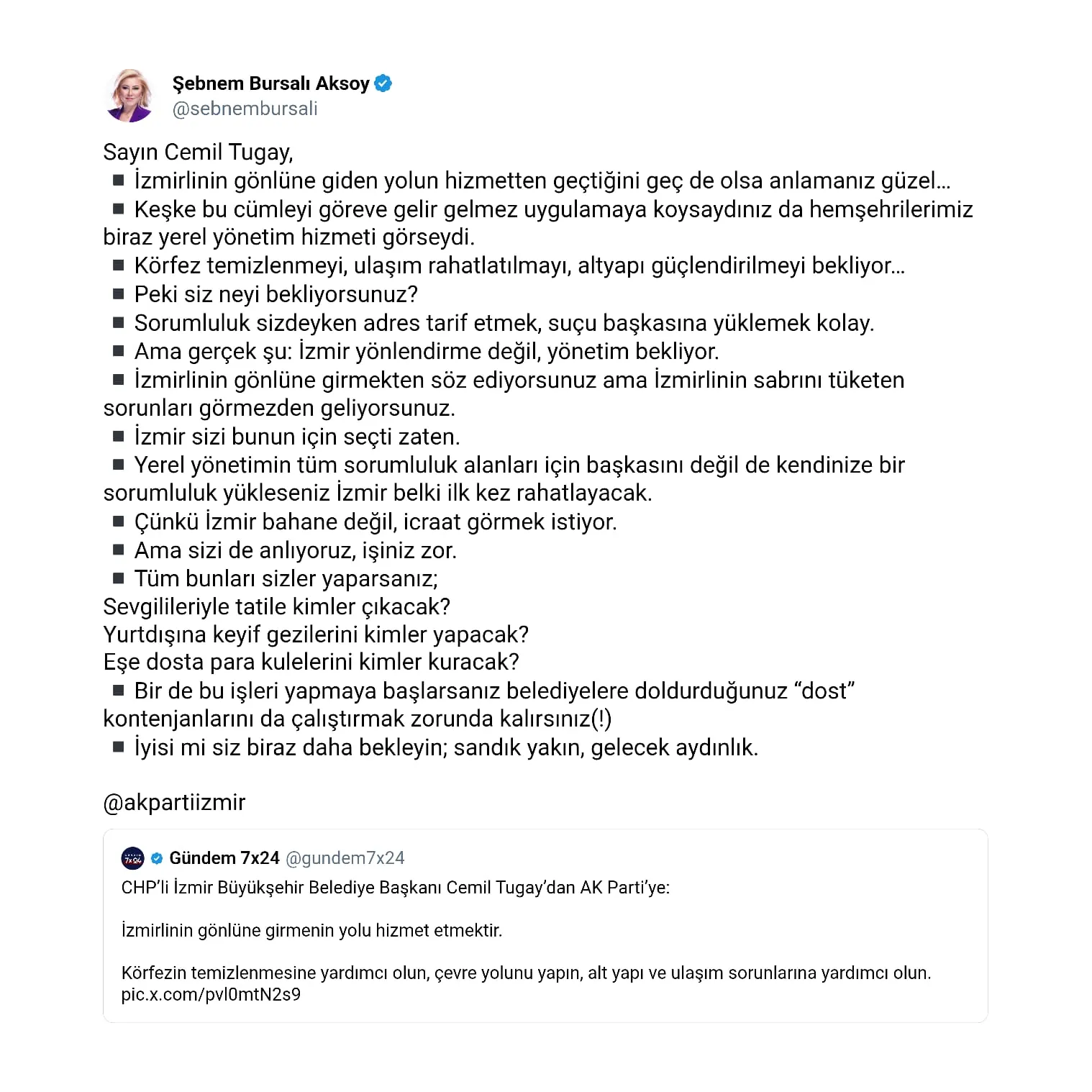 AK Parti İzmir Milletvekili Şebnem Bursalı Aksoy, İzmir Büyükşehir Belediye Başkanı Cemil Tugay'ın iktidara yönelik söylediği "İzmirlinin gönlüne girmenin yolu hizmet etmektir. Körfezin temizlenmesine yardımcı olun, çevre yolunu yapın, alt yapı ve ulaşım sorunlarına yardımcı olun" sözlerine sosyal medya hesabı üzerinden sert yanıt verdi. Bursalı, yaptığı paylaşımda, "Sorumluluk sizdeyken adres tarif etmek, suçu başkasına yüklemek kolay. Yerel yönetimin tüm sorumluluk alanları için başkasını değil de kendinize bir sorumluluk yükleseniz İzmir belki ilk kez rahatlayacak. İyisi mi siz biraz daha bekleyin; sandık yakın, gelecek aydınlık" ifadelerini kullandı.