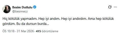 Manisa Belediye Başkanı Besim Dutlulu, sosyal medya hesabından manidar bir göndermede bulundu. “Hep kötülük gördüm…” diyen Dutlulu’nun paylaşımı merak uyandırdı. Dutlulu, gelen yorumlara da yanıt verdi.