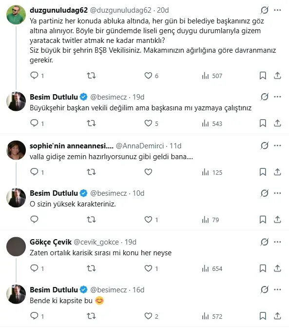Bir kullanıcının "Zaten ortalık karışık sırası mı konu her neyse" yorumuna Başkan Dutlulu, "Bende ki kapsite bu" yorumu yaparken başka bir kullanıcının "Valla gidişe zemin hazırlıyorsunuz gibi geldi bana...." sözlerine de "O sizin yüksek karakteriniz." cevabı verdi.