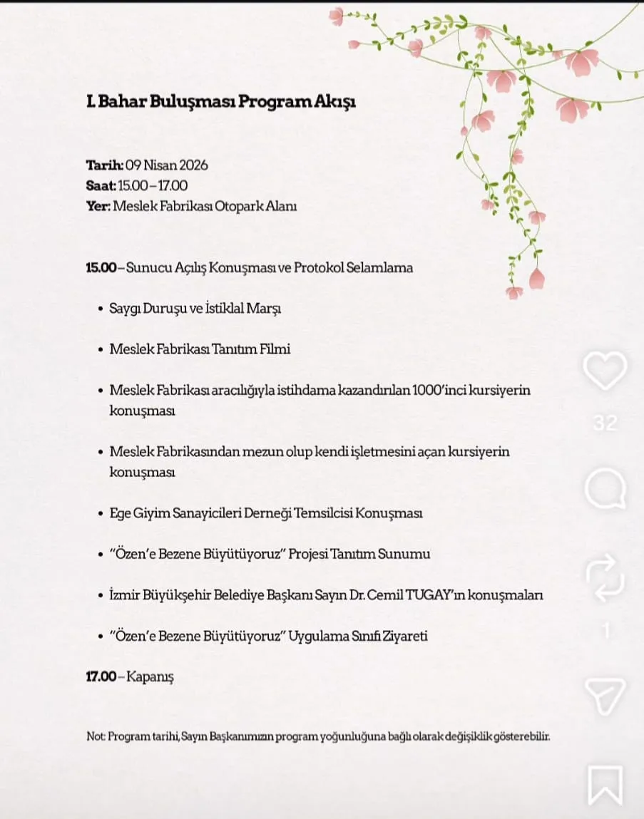 İzmir Büyükşehir Belediyesi, Vakıflar Genel Müdürlüğü tarafından tapu devri yapılan ve yargı süreci devam eden Meslek Fabrikası'nda ertelenen tahliye sürecinin yeniden başlayacağı günlerde 'Bahar Buluşması' adı altında bir etkinlik düzenleyerek adeta 'Ben burada olmaya devam edeceğim' mesajı vermeye hazırlanıyor.