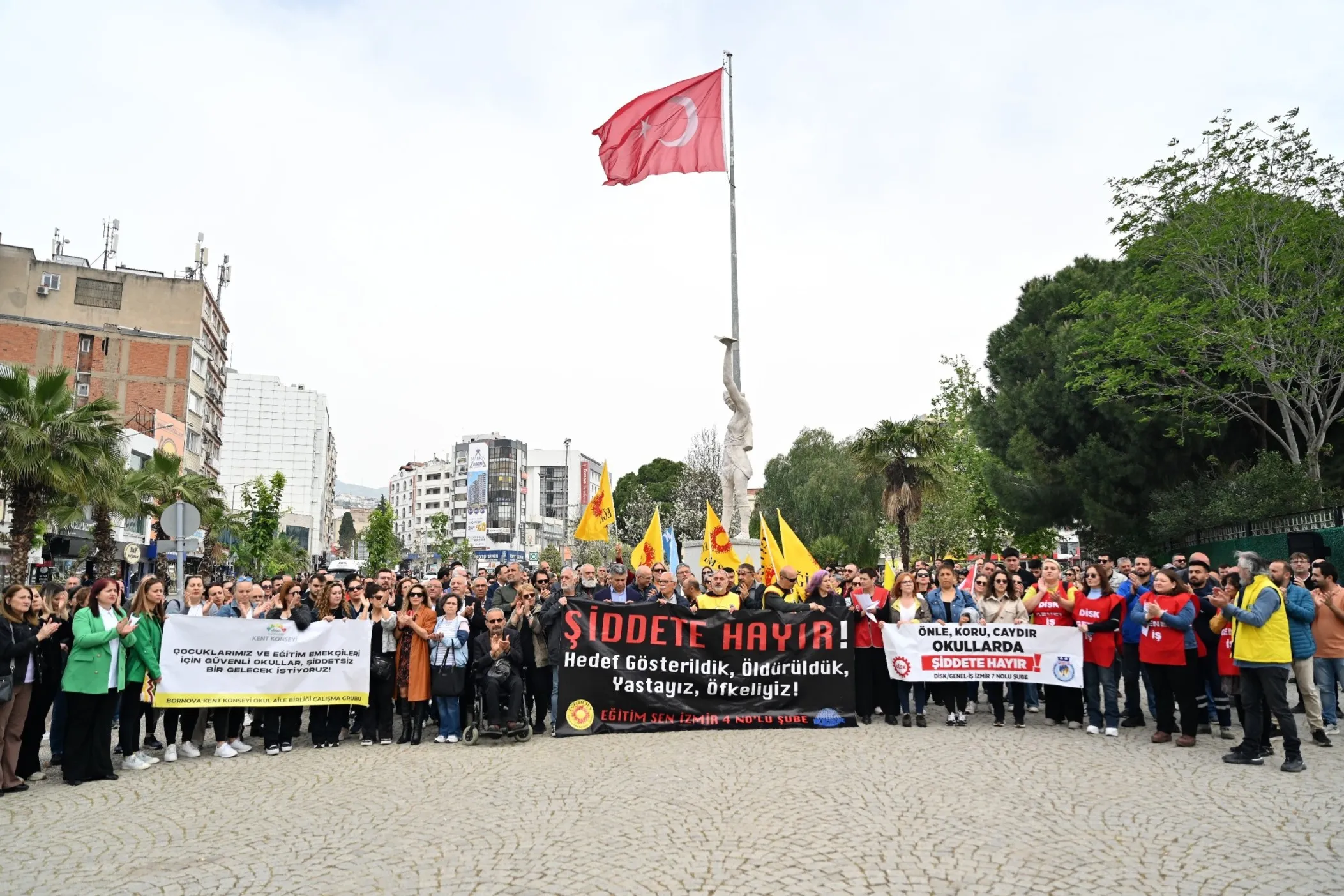 Bornova Cumhuriyet Meydanı, Şanlıurfa ve Kahramanmaraş’ta yaşanan okul saldırılarının ardından güçlü bir toplumsal tepkiye sahne oldu. Bornova Kent Konseyi Okul Aile Birlikleri Çalışma Grubu ile DİSK Genel-İş İzmir 7 No’lu Şube’nin çağrısıyla düzenlenen eyleme, Bornova Belediye Başkanı Ömer Eşki, sendikalar, meslek örgütleri, sivil toplum kuruluşları, belediye çalışanları ve çok sayıda yurttaş katıldı. Bornova Emek ve Demokrasi güçlerinin geniş katılımı, eylemin kitleselliğini ve toplumsal karşılığını gözler önüne serdi.