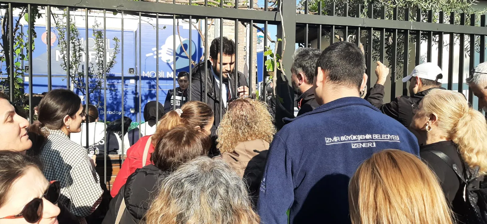 İçeride Vakıflar Bölge Müdürlüğü personeli ve İzmir Büyükşehir Belediyesi bürokratları bulunuyor. Binada bulunan ve İzmir Büyükşehir Belediyesi'ne ait olan demirbaşlar ile sarf malzemelerinin tutanak altına alındığı, işlemin bitmesinin ardından binanın mühürleneceği ifade ediliyor. Belediye yetkilileri, kendilerine herhangi bir tahliye emri ya da başka resmi bir belgenin iletilmediğini, sürecin mahkeme kararlarına istinaden yapıldığını belittiler. Bu arada İzmir Büyükşehir Belediye Başkanı Cemil Tugay'ın Türkiye saati ile 11:30'da Fransa'dan uçağa bineceği öğrenilirken, yaklaşık 3 saat süren yolculuk sonrası öğleden sonra 15:00 Meslek Fabrikası'nda olması bekleniyor. Binanın önünde bekleyenler arasında Konak Belediye Başkanı Nilüfer Çınarlı Mutlu, Baro Başkanı Sefa Yılmaz, Disk Ege Bölge Temsilcisi Deniz Gümüstekin, şube başkanları, büyükşehir belediyesi meclis üyeleri de bulunuyor.