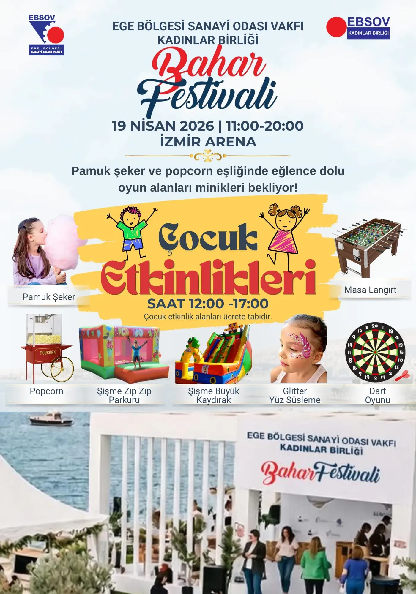 19 Nisan Pazar günü İzmir Arena'da gerçekleştirilecek Bahar Festivali'nde 7'den 70'e herkesin ilgi alanın göre etkinler yer alacak. Çocuklar için kurulacak oyun alanında pamuk şekerden, şişme parkura, yüz boyamadan masa oyunlarına kadar birçok etkinlik miniklere eğlenceli anlar yaşatacak. Festivalde lezzet noktaları, sahne etkinlikleri, DJ performansları, çeşitli yarışmalar ve alışveriş stantları yer alacak. 11:00-20:00 saatleri arasında düzenlenecek Bahar Festivali'nde İzmir Tavla Derneği tarafından gerçekleştirilecek tavla yarışmasının yanı sıra Op. Dr. Volkan Tekin de kadınlara yönelik sağlık tavsiyelerinin olduğu söyleşi ile Ailemin Kadınları Okuma Tiyatrosu'nun oyunu da yer alacak. Festival alnına giriş ücretsiz olacak.