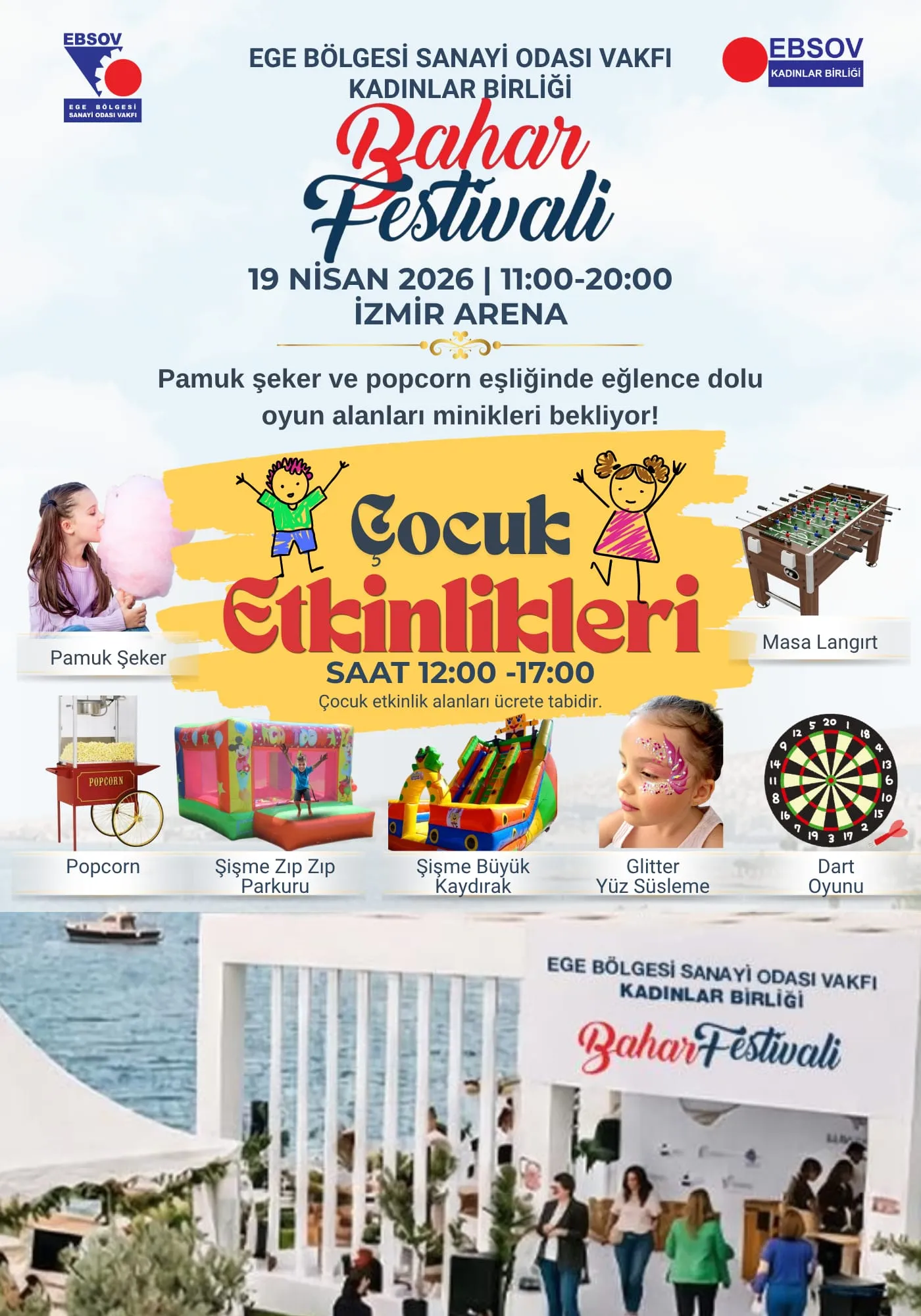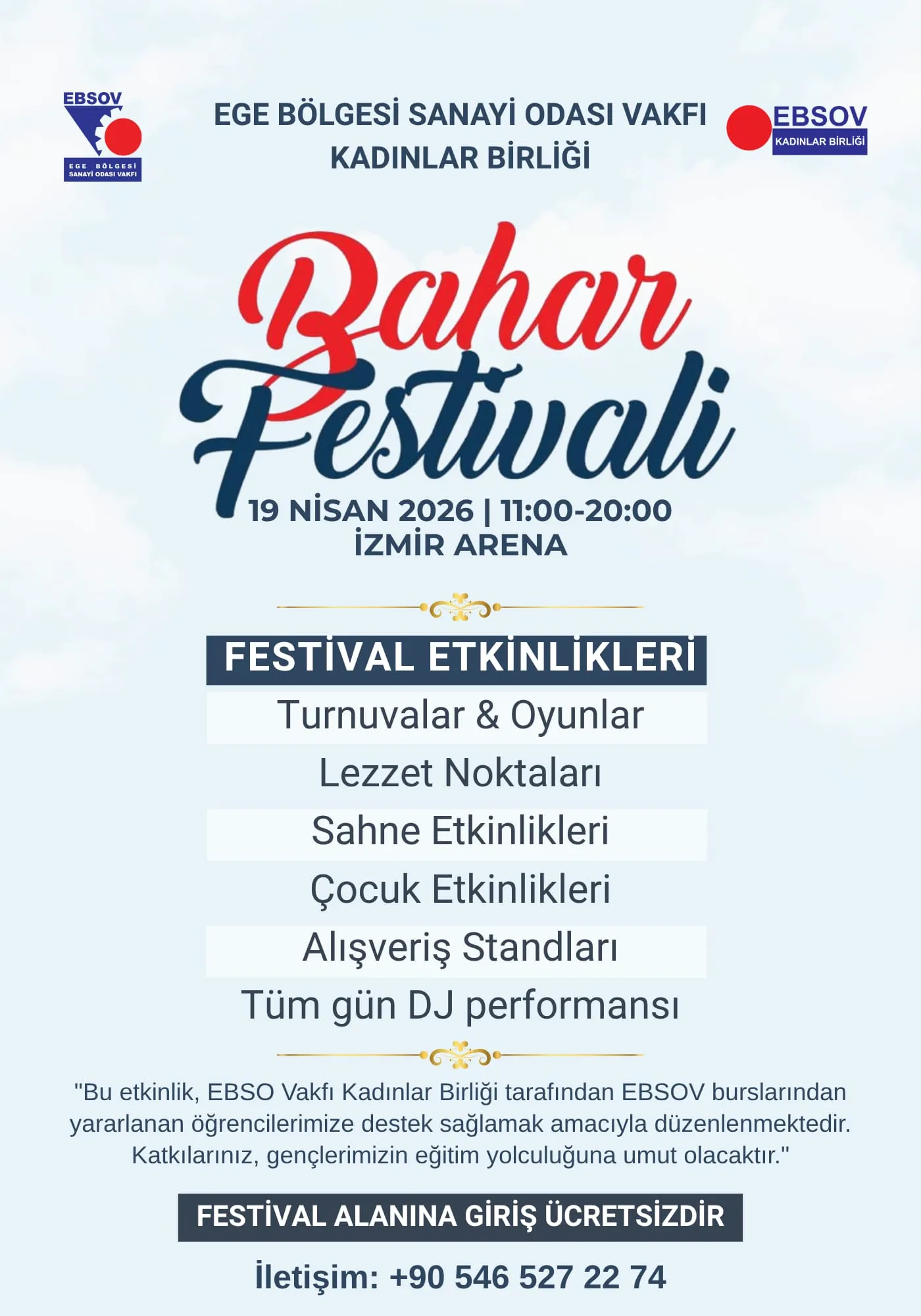 İzmir'de yıllardır başarılı ve ihtiyaç sahibi öğrencilere verdiği destekle tanınan Ege Bölgesi Sanayi Odası Vakfı (EBSOV) Kadınlar Birliği, eğitim burslarına destek olmak için bir organizasyona daha ev sahipliği yapmaya hazırlanıyor. 25 yıldır düzenledikleri kermesler, konserler, sergiler, festivallerle vakıf bursiyerlerine destek olan Kadınlar Birliği, baharın gelişini üyeleri ve İzmirlilerle Bahar Festivali'nde kutlayacak. 19 Nisan Pazar günü gerçekleştirilecek Bahar Festivali'nden elde edilecek tüm gelir EBSOV burslarından yararlanan öğrencilere destek olarak aktarılacak.