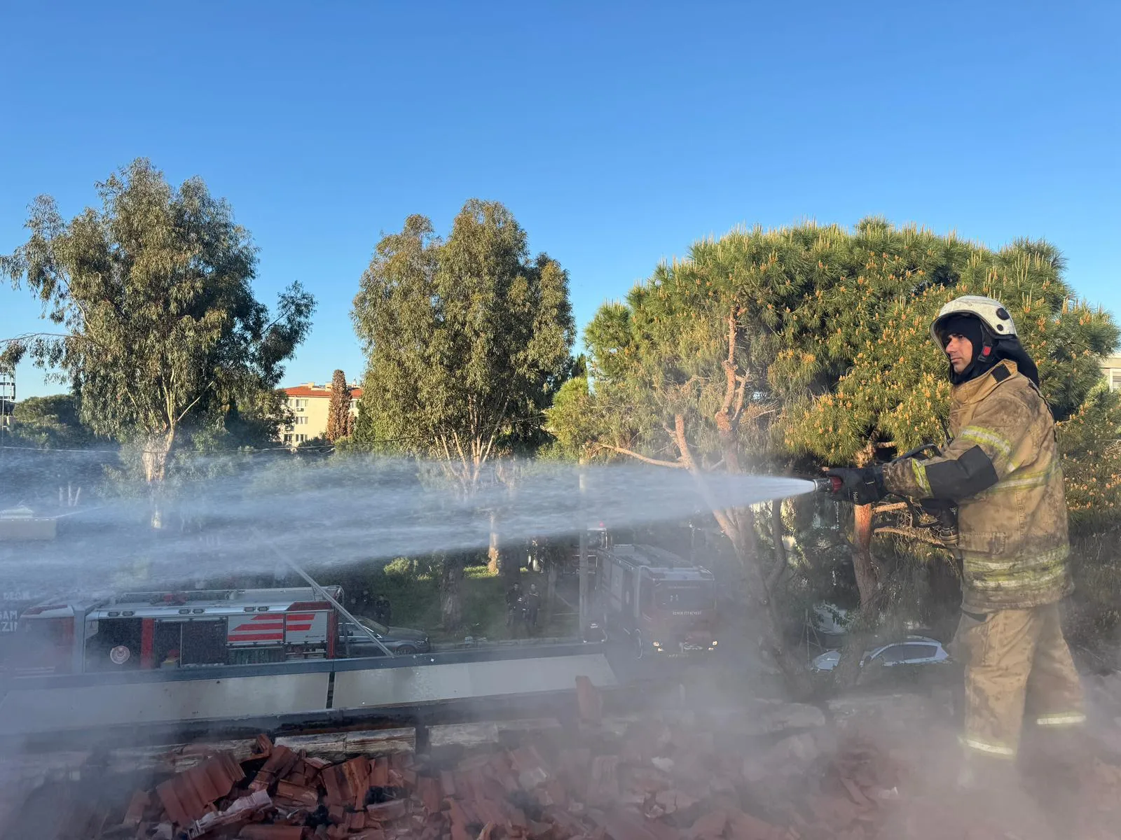İzmir’in Karşıyaka ilçesi Bostanlı Mahallesi Cengiz Topel Caddesi’nde bir restoranın çatı kısmında çıkan yangın, kısa sürede büyüyerek çevredeki yapılara sıçradı. İhbar üzerine İzmir Büyükşehir Belediyesi İtfaiye Dairesi Başkanlığı ekipleri olay yerine sevk edildi. İtfaiye ekiplerinin yoğun müdahalesi ile yangın büyümeden kontrol altına alındı.