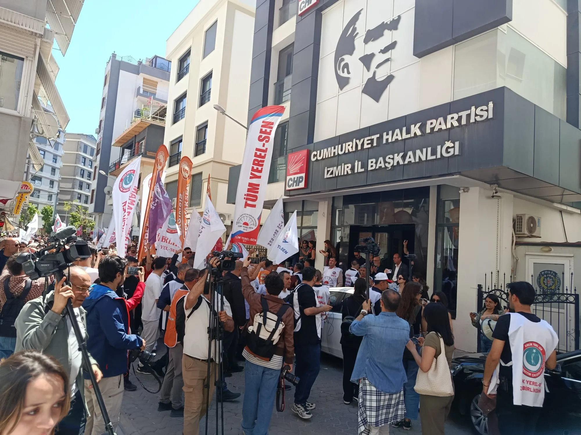 Günlerdir Buca, Bayraklı, Karşıyaka ve Narlıdere belediyelerinde toplu iş sözleşmeleri ve sosyal denge tazminatı konusunda uzlaşmayan sendikalar, CHP İzmir İl Başkanlığı önünde açıklama yaptı. Bir kaç gün önce CHP İzmir İl Başkanı Çağatay Güç ile görüşen, ancak Güç'ün arabuluculuk sürecinden bir sonuç çıkmaması üzerine Basmane Meydanı'ndan CHP İl binasına yürüyen, sendikalar, eylemlerin süreceği belirtildi.