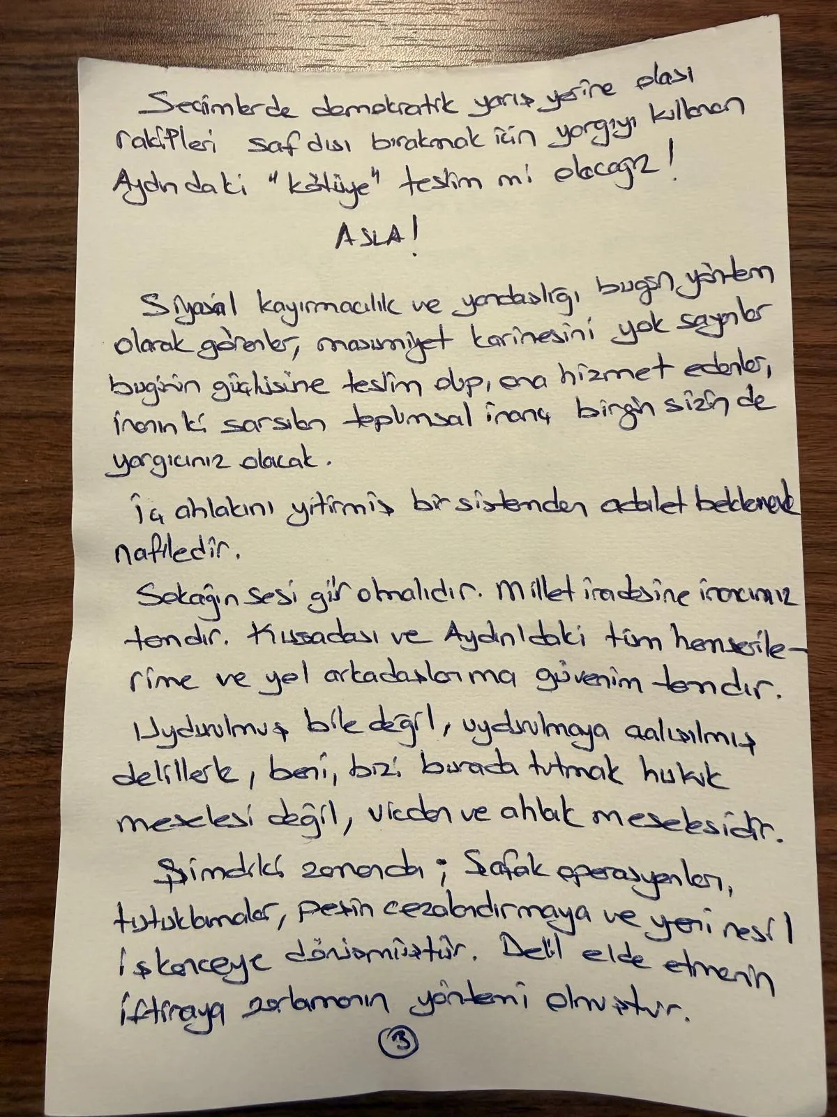 İç ahlakını yitirmiş bir sistemden Adalet beklemek nafiledir. Sokağın sesi gür olmalıdır. Millet iradesine inancımız tamdır. Kuşadası ve Aydın'daki tüm hemşehrilerime ve yol arkadaşlarıma güvenim tamdır. Uydurulmuş bile değil, uydurulmaya çalışılmış delillerle, beni, bizi burada tutmak hukuk meselesi değil, vicdan ve ahlak meselesidir.