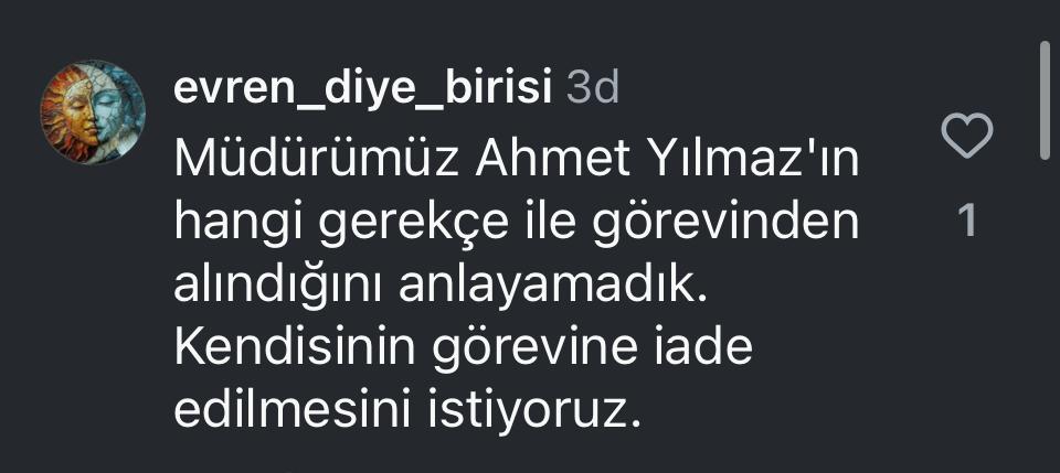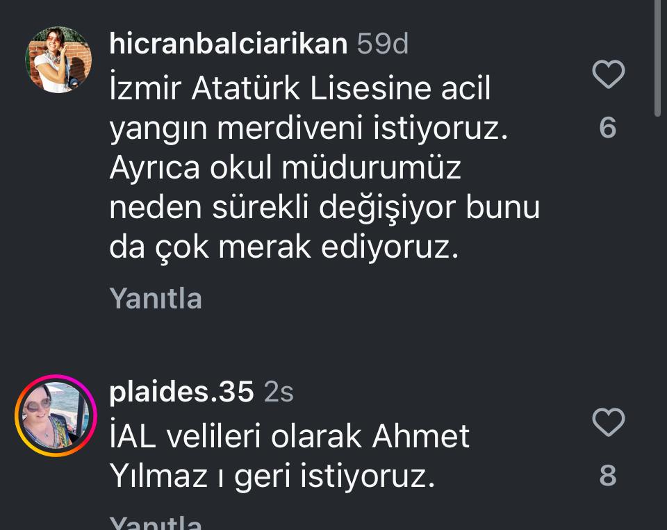 (Ahmet Yılmaz, öğrencilerle kurduğu sıcak iletişim ile dikkat çekiyordu.)YERİNE HİÇYILMAZ GETİRİLDİOkuldaki bu değişim tepkilere neden oldu. Bu tepkiler nedeniyle ilginç bir uygulamaya gidildi. Konak İlçe Milli Eğitim Müdürü Metin Ender Karabulut’un Yasin Hiçyılmaz’a bugün yaptığı ziyaretle ilgili okulun instagram’daki resmi hesabından yapılan paylaşım yorumlara kapatıldı.OKUL HESABINDAKİ PAYLAŞIMI YORUMA KAPATTIRDI