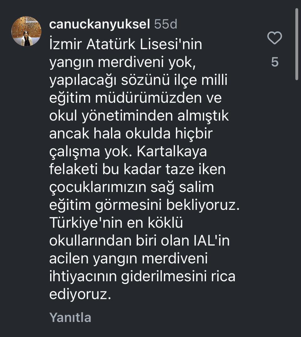 Okul velilerinin, Okul ve Konak İlçe Milli Eğitim Müdürlüğü hesapları yoruma kapalı olduğundan Müdür atamasına yönelik eleştirilerini ve okuldaki ‘yangın merdiveni’ eksikliği sorununu, İzmir İl Milli Eğitim Müdürlüğü’nün yoruma açık hesabından ilettiği öğrenildi. Bunu üzerine İl Milli Eğitim Müdürlüğü’nün hesabının da bu şikayetlerin yapıldığı gönderiyi yorumlara kapadığı kaydedildi.